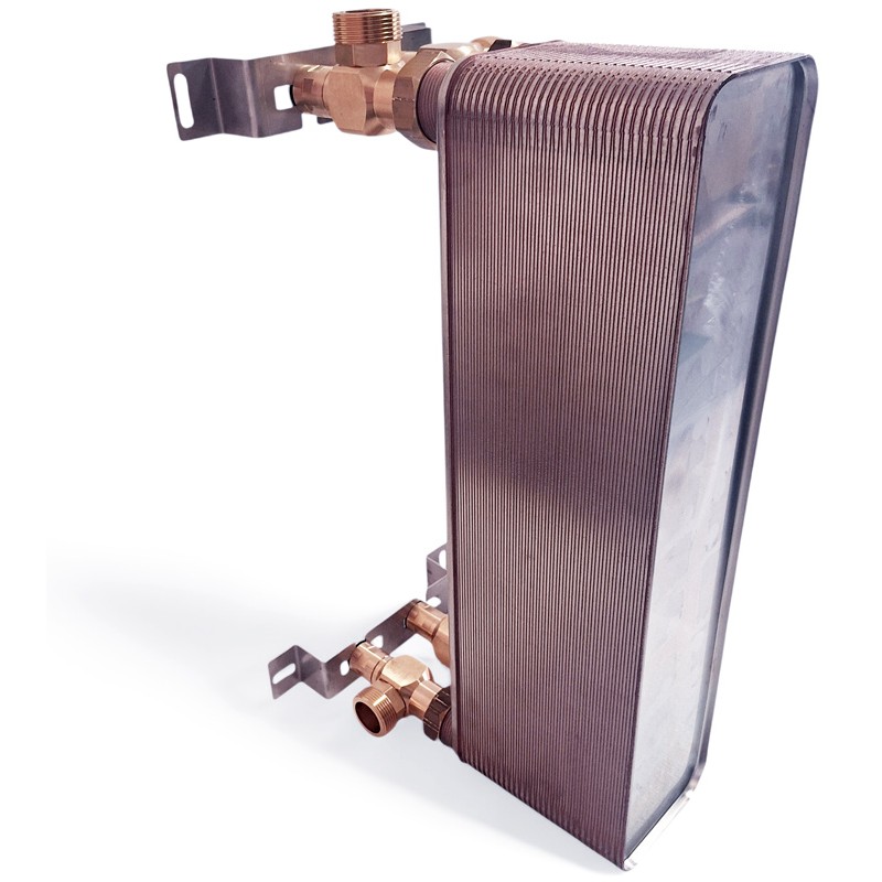 Wenn unsere 24 kW Wärmepumpe in einem Glykolkreislauf betrieben wird, ist es ratsam, sie mit einem Plattenwärmetauscher von der Heizungsanlage zu trennen, um zu vermeiden - dass der Kreislauf mit Glykol gefüllt werden muss (-> dies würde sich negativ und ungünstig auf den Gesamtbetrieb des Systems auswirken und unnötig seine Trägheit erhöhen). Hierfür ist der Ba-60-60 Plattenwärmetauscher mit 60 Platten und einer Wärmeaustauschfläche von 3,6 m² geeignet. Dieser Wärmetauscher ist perfekt auf 24-kW-Wärmepumpen abgestimmt - jedoch vor allem für Systeme, bei denen die Vorlauftemperatur im Bereich von 50°C liegt.