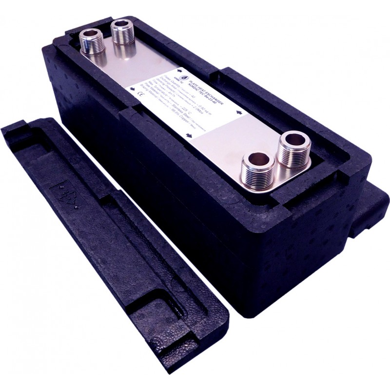 Es handelt sich um einen herkömmlichen gelöteten Plattenwärmetauscher, der im Grunde universell einsetzbar ist, da er mit nahezu jeder Wärmequelle betrieben werden kann. Am häufigsten wird er jedoch als Wärmetauscher für Monoblock-Wärmepumpen verwendet, d.h. zur Anbindung der Wärmepumpe an das Heizsystem eines Gebäudes oder zur Erwärmung von Wasser. Gemeint sind dabei natürlich Monoblock-Wärmepumpen, die mit Glykol (oder Wasser) befüllt sind. Dieser Wärmetauscher ist aufgrund seiner hervorragenden Wärmeaustauschparameter für größere Wärmepumpen konzipiert. In den meisten Fällen werden für Wärmepumpen in Einfamilienhäusern kleinere Geräte verwendet. Falls Sie eine Beratung zur Auswahl benötigen, können Sie sich gerne an unser Team wenden.
