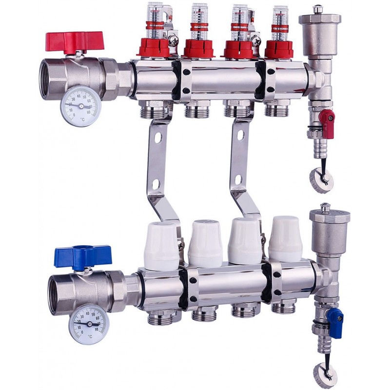 Verteiler für Fußbodenheizung mit 4 Kreisen: Variante mit Ventilen und Thermometern – Komplettset