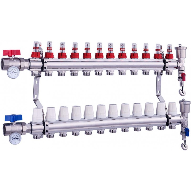 Heizkreisverteiler für Fußbodenheizung mit 12 Fach – klassischer, komplett ausgestatteter Verteiler, inklusive Ventilen mit Temperaturmessung für Vorlauf und Rücklauf.