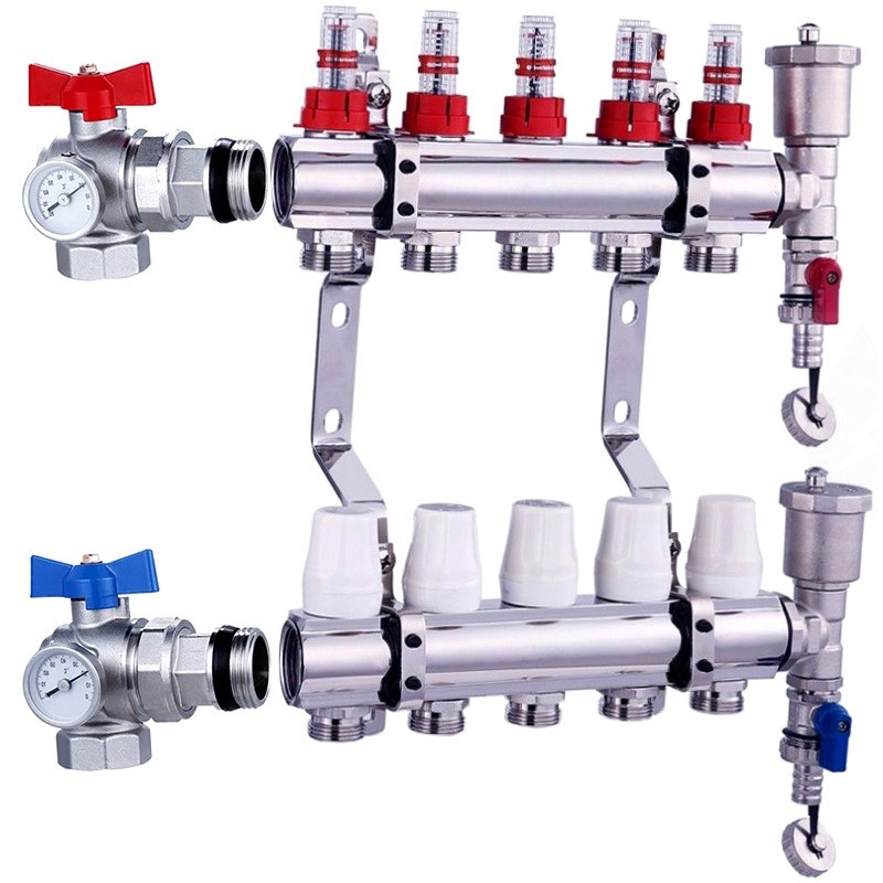 Heizkreisverteiler FBH Messing Verteiler mit geradem Ventil und Thermometer