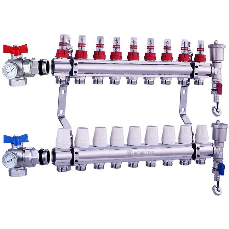 Fußbodenheizungsverteiler - Messing Verteiler für 9 Heizkreise. Das Produkt der Marke NORDIC TEC - ein Komplettset, das keine separaten Montageelemente erfordert. Es enthält alles, was auf dem Bild dargestellt ist. Optional kann der Verteiler auch mit Eurokonus-Adaptern 3/4x16mm ausgestattet werden.