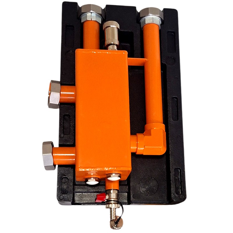 Hydraulische Weiche für Pumpengruppen und Pumpenbaugruppen, zur Zusammenarbeit mit Kesselverteilern. Leistung der hydraulischen Weiche bis 60 kW, ausgelegt für relativ kleine hydraulische Systeme. Sie fungiert gleichzeitig als hydraulische Weiche und als Schmutzabscheider, wobei abgesetzter Schmutz über ein Ablassventil entfernt werden kann.