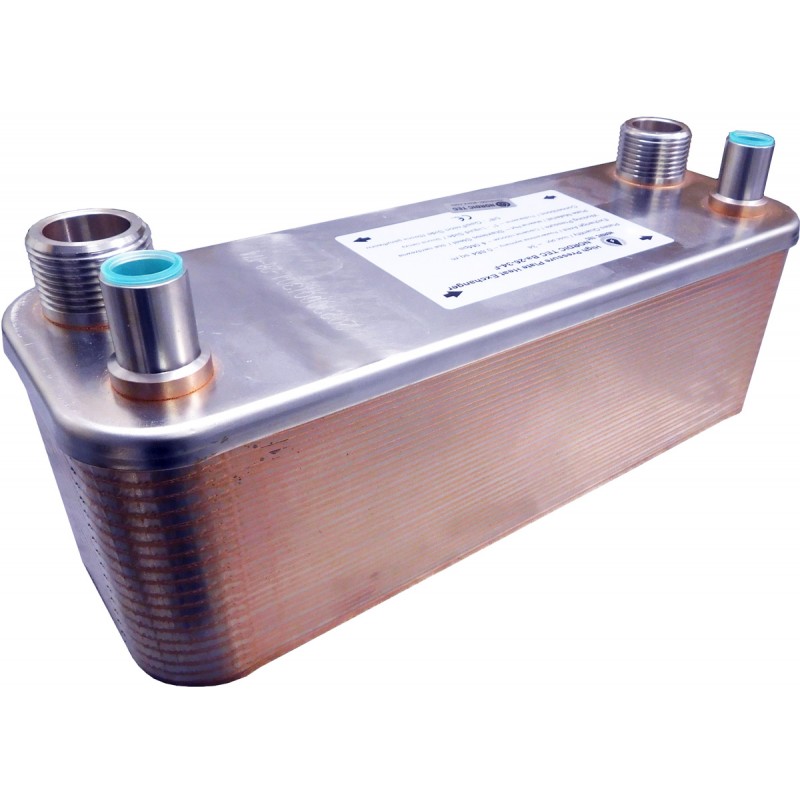 Plattenwärmetauscher für Kältemittel oder Gas-Medien, 70 Edelstahl Platten - Hochdruckausführung ( < 45 bar ), geeignet für Flüssigkeiten (auf der Verbraucherseite - erster Kanal) sowie Kältemittel (auf der gegenüberliegenden Seite). Der Wärmetauscher kann als Verflüssiger oder Verdampfer für Wärmepumpen oder Klimaanlagen umfunktioniert werden, die zu Hause als Wärmepumpe dienen. Er eignet sich hervorragend für den Einsatz mit Kältemitteln in Anwendungen, die 4,5 MPa nicht überschreiten.