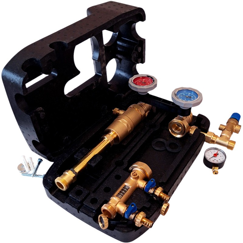 - besteht üblicherweise aus zwei Absperrventilen, einer Halterung für die Umwälzpumpe, einem Rotameter, einem Sicherheitsventil, einem Manometer und einem Luftabscheider