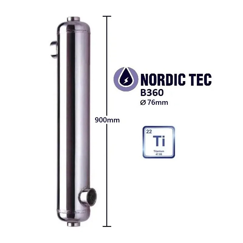 Die B360-Ti-Wärmetauscher sind, wie andere Modelle der Nordic Tec-Serie -Ti, vollständig aus Titan gefertigt. Es handelt sich um reines Titan ohne Zusätze. Dieses Material wurde sowohl für die Rohre, das Gehäuse des Geräts als auch für die Anschlüsse verwendet.