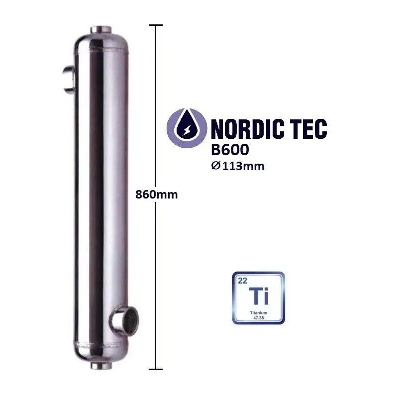 Der Titan-Wärmeübertrager B600 ist ein Rohrbündelwärmeübertrager, der sich durch niedrige hydraulische Widerstände auszeichnet. Die häufigste Anwendung ist die Pooltechnik, insbesondere bei der Beheizung von Pools mit salzhaltigem Wasser.